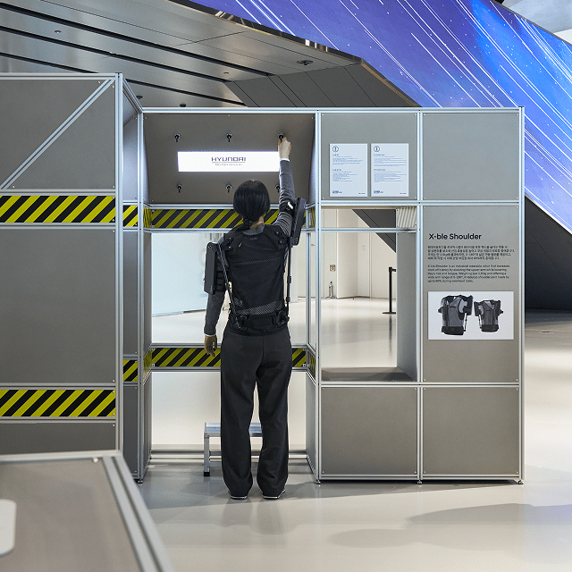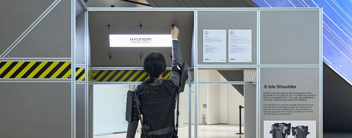 현대자동차그룹 로보틱스랩의 웨어러블 로봇 엑스블 숄더는 착용 시 팔 상완부를 보조해 산업 효율성을 높이고 부상 위험과 피로를 줄여줍니다. 무게는 단 1.9kg에 불과하지만, 0~180º의 넓은 가동 범위를 제공하고, 머리 위 작업 시 어깨 관절 부담을 최대 60%까지 줄여줍니다.