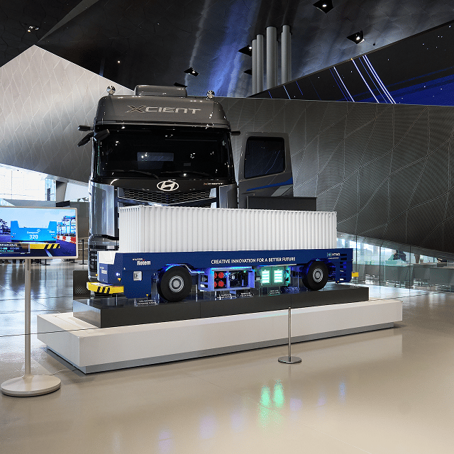 부산 신항 7부두에 적용된 현대로템의 항만 AGV는 길이 16m 전기 무인 운송차로 최대 65톤 컨테이너를 운송합니다. 30분 충전으로 8시간 운행하며 트랜스폰더 기반 자율주행과 FMS 관제로 작업관리/트래픽관리/자동충전이 이루어지는 항만 자동화 시스템입니다. 또한 수소연료전지 기술을 접목해 친환경 시스템을 개발함으로써 차세대 항만 물류의 새로운 가능성을 탐색하고 있습니다.